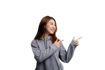 Beautiful Asian woman gesturing for advertisement editing on isolated background, portrait concept used for advertisement and signage, isolated, copy space.