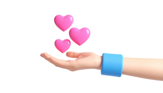 3D illustration of a stylized hand offering floating pink heart shapes against a dark background