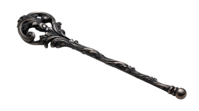 Ornate silver scepter with rococo details, antique metal royal staff symbol of power, authority, and fantasy item