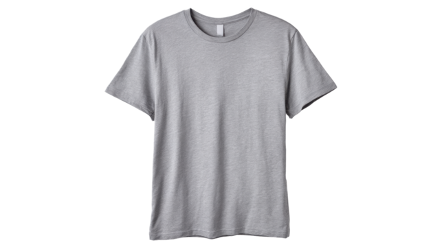 Grey blank t shirt providing plain mockup space for custom branding, designs, and text, featuring soft cotton texture with a transparent background for versatile use
