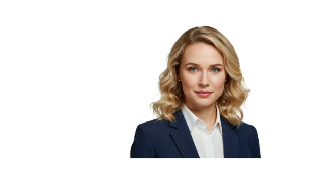 Professional headshot of a blonde woman in a suit for business profile or corporate website design needs on transparent background