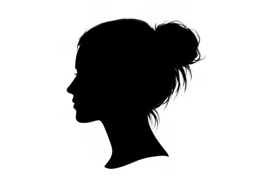Woman's head silhouette in profile with hair bun, representing thoughts, identity and feminine beauty, transparent background