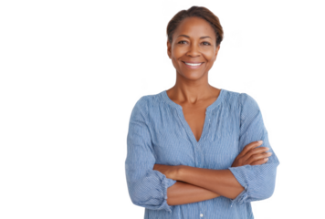 A confident woman smiling and looking to the side, with crossed arms, against a white background. Ideal for diverse lifestyle and empowerment themes.