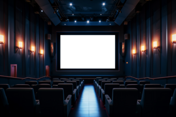 Elegant auditorium with blank presentation screen, chairs, and modern lighting setup for business, corporate events, and educational presentations.