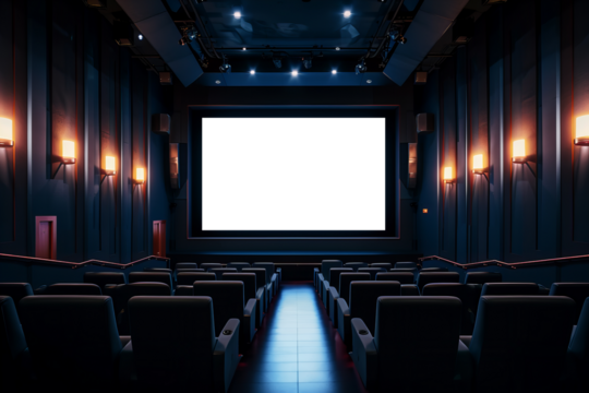 Movie theater with black and red cinema seats and empty screen with copy space, isolated on white or transparent background, png. Generative Ai.