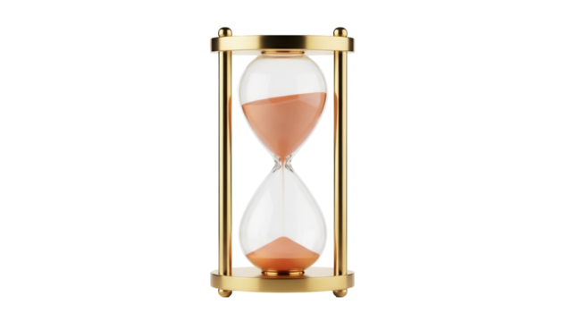 Glass hourglass with wooden base and white sand isolated on the transparent background representing time and countdown concept