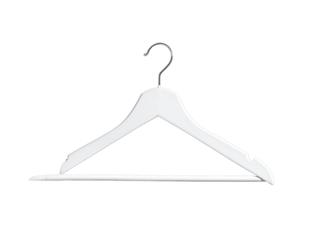 A simple white wooden clothes hanger hangs isolated on a stark black background