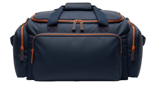 Isolated navy-blue duffel bag or sports bag with orange accents on a neutral background
