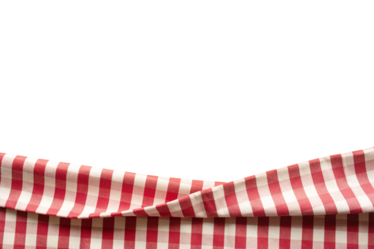 Two checkered tablecloths (one red and white, the other brown and white) with wooden kitchen utensils, isolated on transparent background. Template for a food menu or recipes.