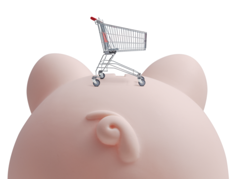 Man holding pink piggy bank near cardboard boxes on transparent background