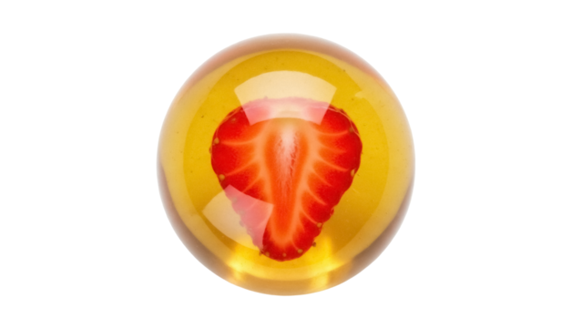 Strawberry half in amber sphere isolated PNG, fruit slice encased in resin ball for decoration and design elements on transparent background
