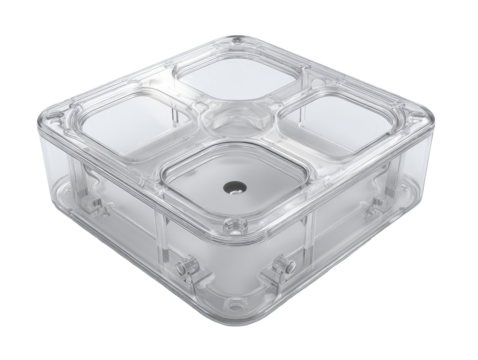 Clear plastic enclosure houses a gold-colored terminal block with multiple connections