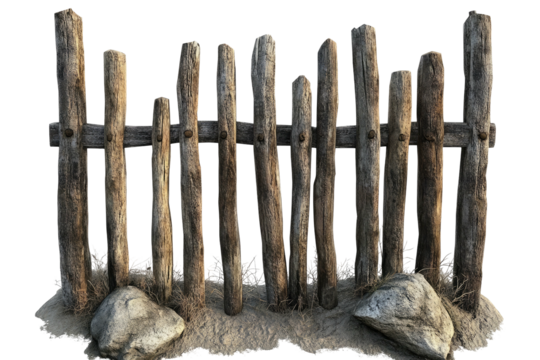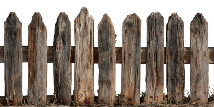 Rustic wooden fence, weathered and aged, with pointed tops, providing a sense of enclosure
