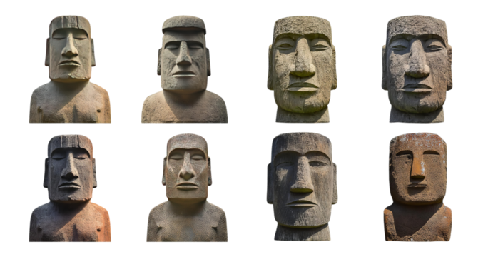 Stone Statues of Moai in Different Aspects and Angles, Bundle Set Collection, Isolated on Transparent Background