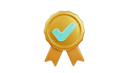 Golden Seal of Approval with Teal Check Mark and Orange Ribbons on Transparent Background