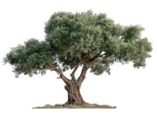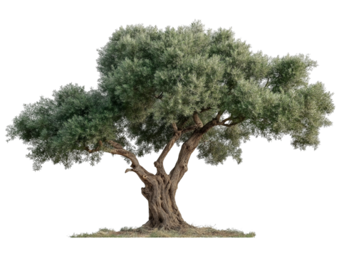 Ancient Gnarled Olive Tree with Lush Green Foliage isolated on a transparent background