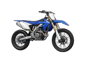 Blue and White Dirt Motorcycle With Black Tires and Gold Forks On Transparent Background