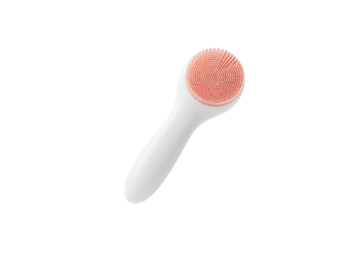 A horizontally floating facial cleansing brush on solid white background