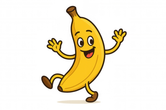 Banana cartoon character walking and waving, cute fruit mascot presenting and greeting, cheerful healthy food illustration