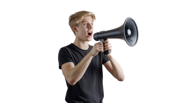 Young Caucasian man, 20, casual wear, short blonde hair - Using the megaphone energetically