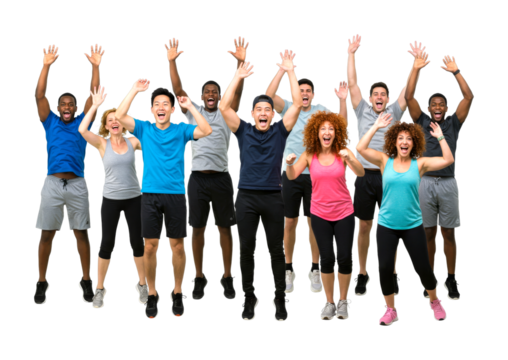 Large multi-ethnic group of athletes in colorful sportswear are jumping together with excited expressions and arms raised in a triumphant celebration of teamwork and success