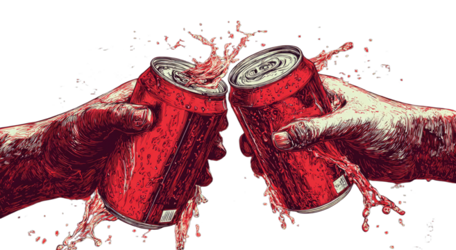 Two hands clinking red cans, splashing red liquid against dark background