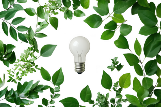 White Lightbulb Surrounded by Lush Green Leaves isolated on a transparent background
