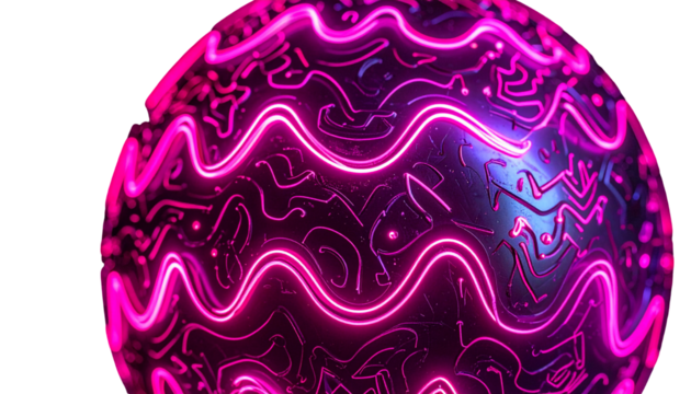 Glowing neon sphere with detailed, curved circuitry over a dark backdrop