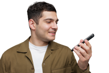 Man engages with smartphone using voice command, showcasing modern communication technology in daily life during a casual moment