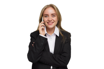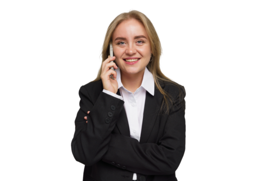 Engaging conversation with a friendly smile from a young woman using a smartphone in a bright, empty background
