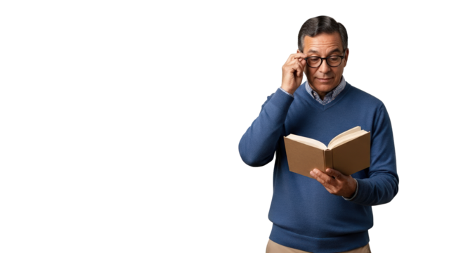 A man reads a book and adjusts his eyeglasses, fully engaged in the story