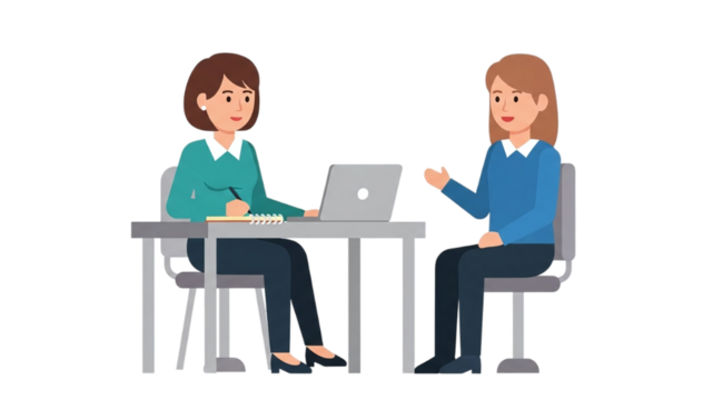 Professional Women Collaborating on Project or Interview in Office Setting, Engaging in Business Meeting or Discussion with Laptop and Notes
