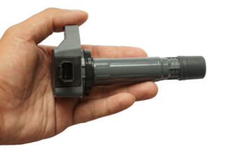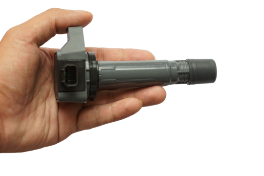 Image of an ignition coil in a mechanic's hand. spare part isolated on white background