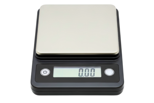 Digital pocket scale with a zero reading on the display screen on a transparent background