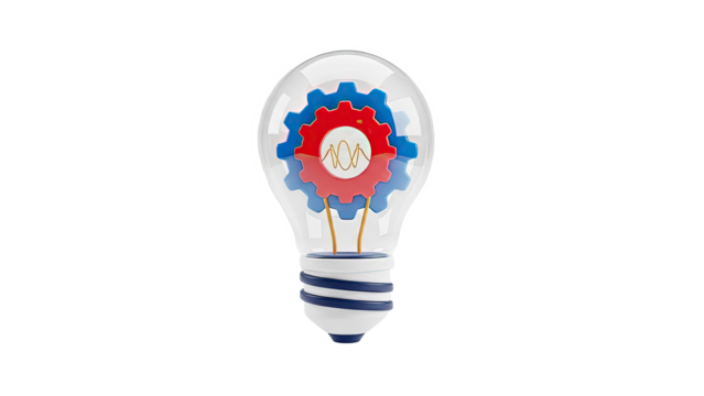 Concept of innovation in mechanics with lightbulb and gears on transparent background