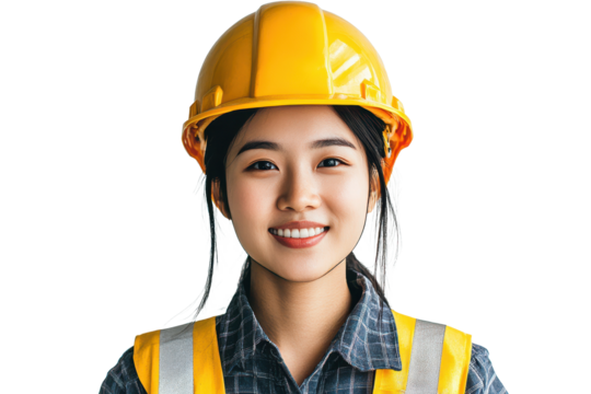 Transparent portrait of smiling engineer wearing yellow hard hat