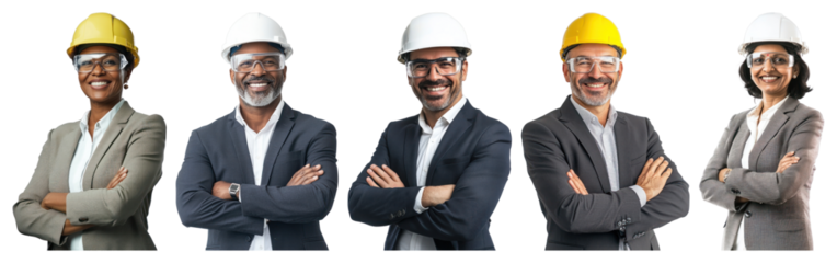 Confident female engineer with transparent hard hat and reflective jacket, arms crossed. Professional, trustworthy. Isolated on transparent background. Ideal for engineering and construction themes.