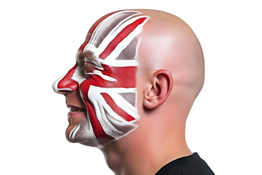 man soccer fun profile portrait with painted face of english national flag isolated on transparent background