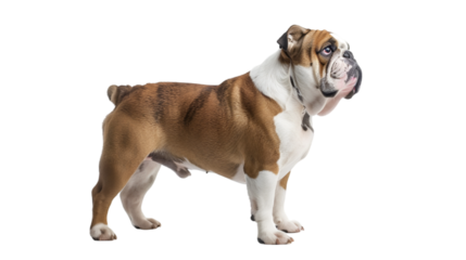 English bulldog with tan and white coat sitting upright in formal pose, isolated on a transparent background