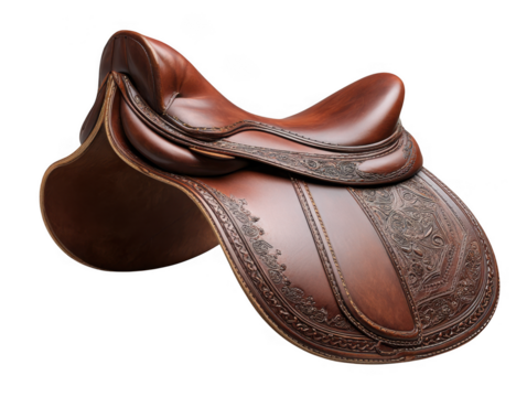 Ornate brown leather horse saddle isolated on transparent background