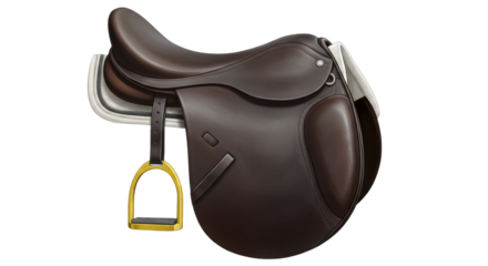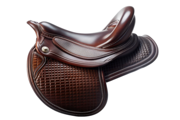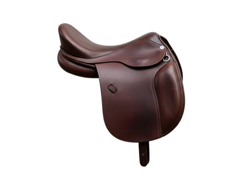 A brown leather english saddle isolated on a transparent background
