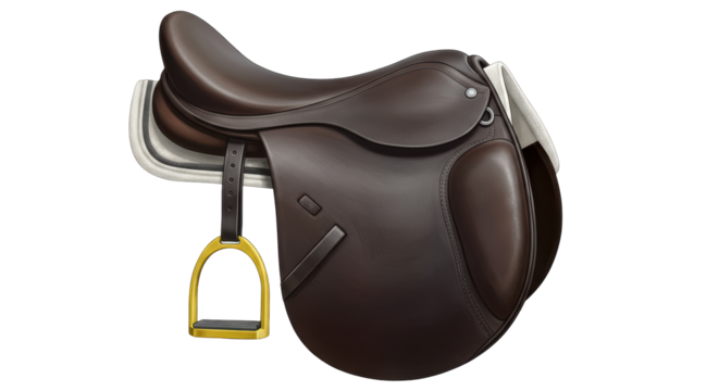 Polished brown leather English riding saddle with detailed stitching and brass accents isolated on a transparent background