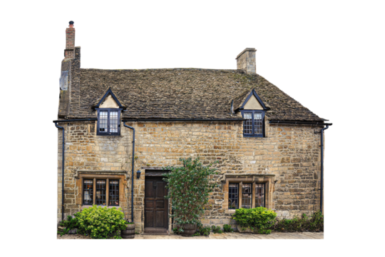 Two-story stone old English cottage linked house in UK isolated transparent png