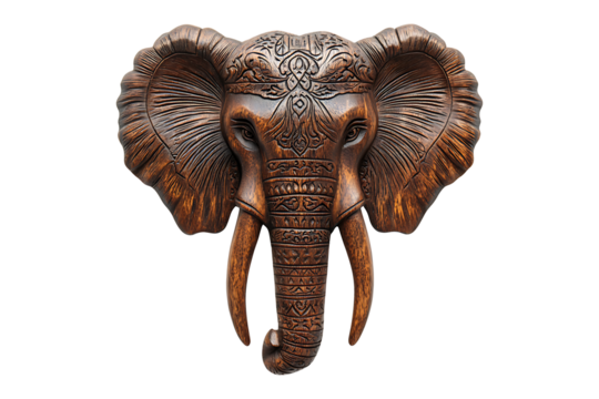 Mahogany wooden engraving Elephant head trophy isolated on transparent background