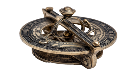 Antique brass diptych sundial instrument with intricate engraving on a stark