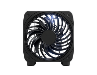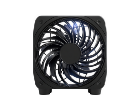 A black computer fan isolated on transparent background, showcasing its intricate blade design and square frame, designed for optimal cooling and performance enhancement