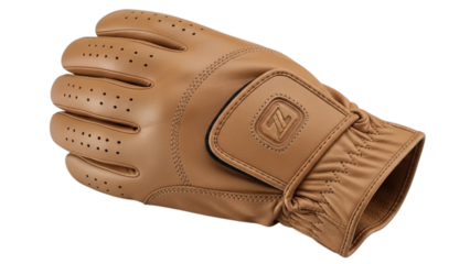 Brown leather golf glove with perforation isolated on transparent background PNG vector illustration realistic sports accessory equipment for golfer hand protection grip enhancement design asset stock