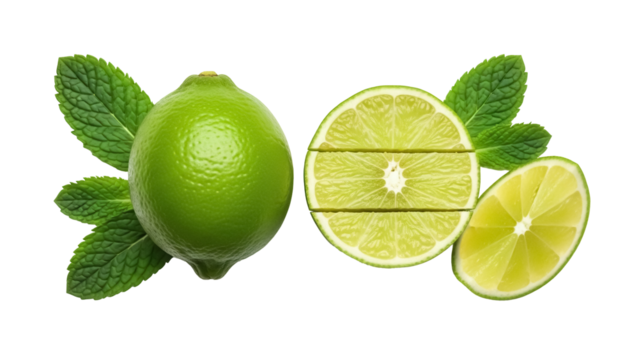 Isolated lime with mint leaves next to sliced lime segments for flavor enhancement diet