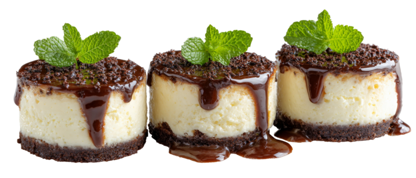 Three delicious mini cheesecakes topped with chocolate sauce and fresh mint leaves, elegantly arranged on a white background, ideal for dessert menus or culinary photography