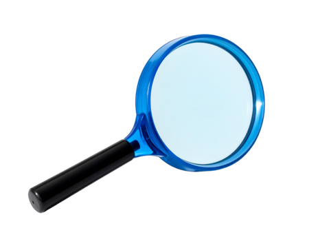 Blue magnifying glass with black handle isolated on transparent background